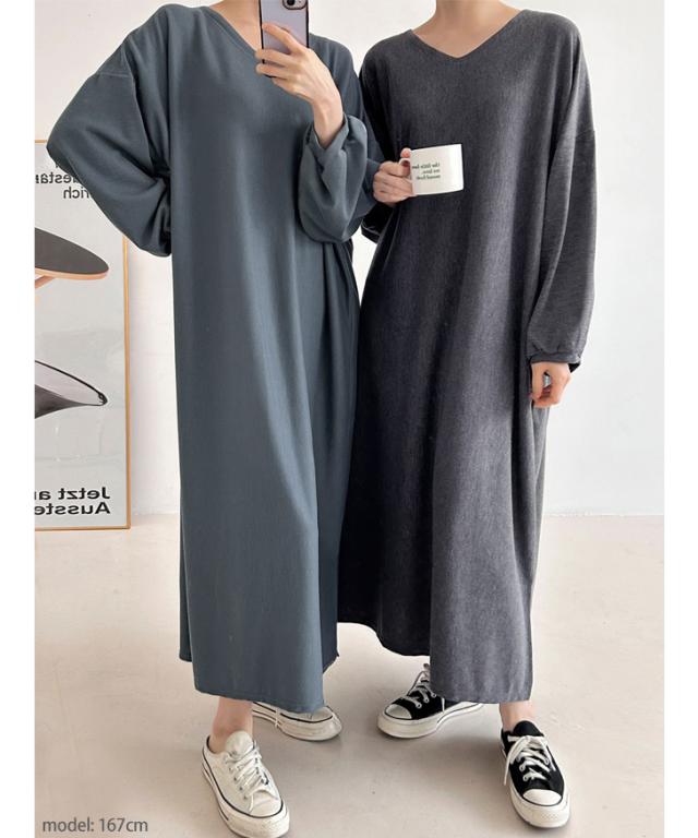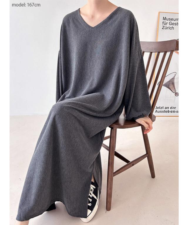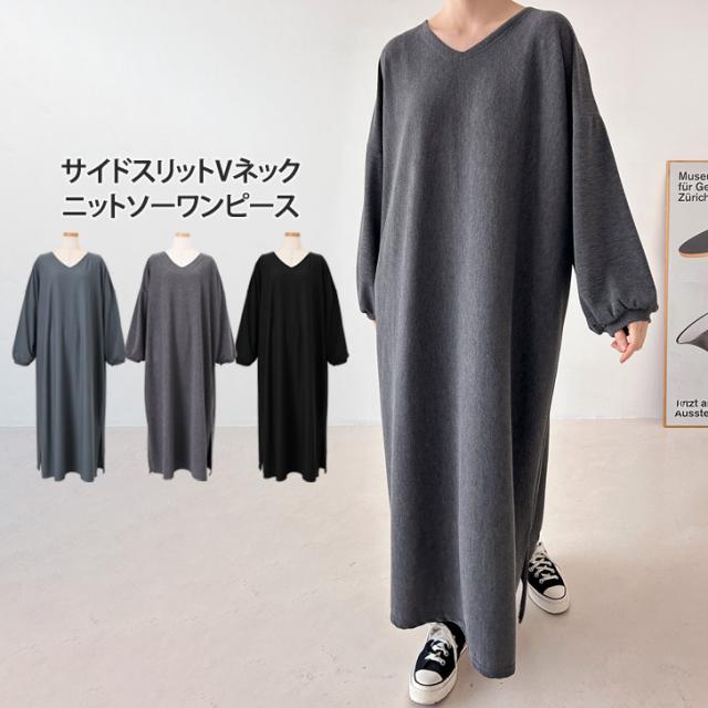 新作 サイドスリットVネックマキシ丈ニットソーワンピース レディース 秋冬 長袖 薄手 高身長 ゆったり 大きいサイズ 大きめ 体型カバー リラックス 可愛い おしゃれ ロング丈 部屋着 ルームウェア カジュアル