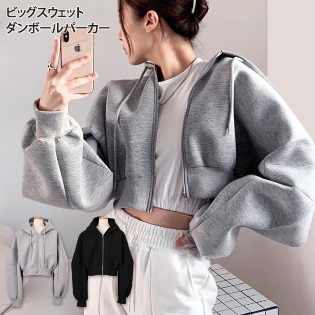 新作 ショート丈ビッグスウェットダンボールパーカー レディース アウター トップス 秋冬 厚手 あったか 防寒 おしゃれ 長袖 ジップ 大きいサイズ 大きめ ゆったり 羽織り 上着 スエット 可愛い 体型カバー