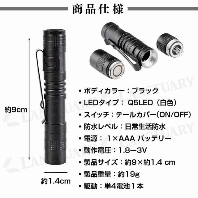 | 主な仕様 | 【サイズ】 約9×1.4cm LEDタイプ: Q5LED(白色) 【製品重量】約19g 【素材】アルミ 【カラー】ブラック 【駆動】単4電池1本 |