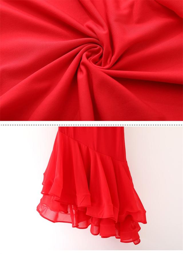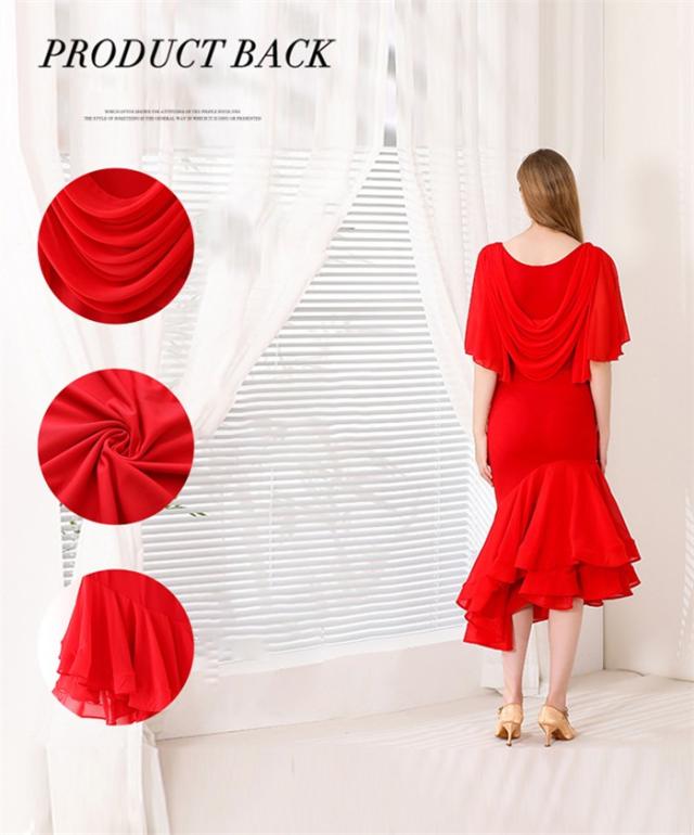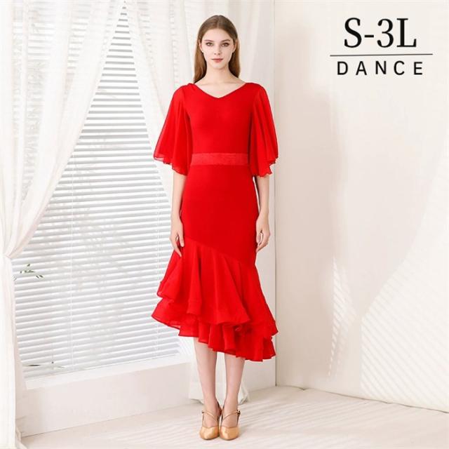 社交ダンスドレス モダンドレス 赤 レッド 社交ダンス衣装 社交ダンス レッドドレス ミモレ丈 スタンダードドレス ワルツダンス ステージ衣装 ダンス衣装 ダンスウェア 競技会 パーティー 発表会 競技着 練習着 舞台 演奏会 演出 d1376d7d7m5