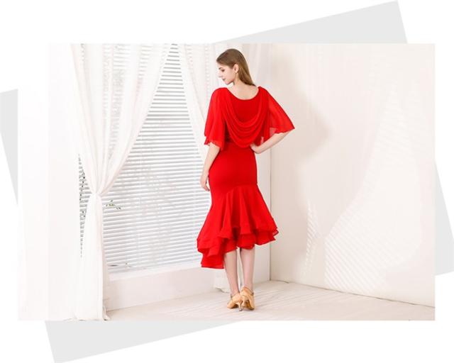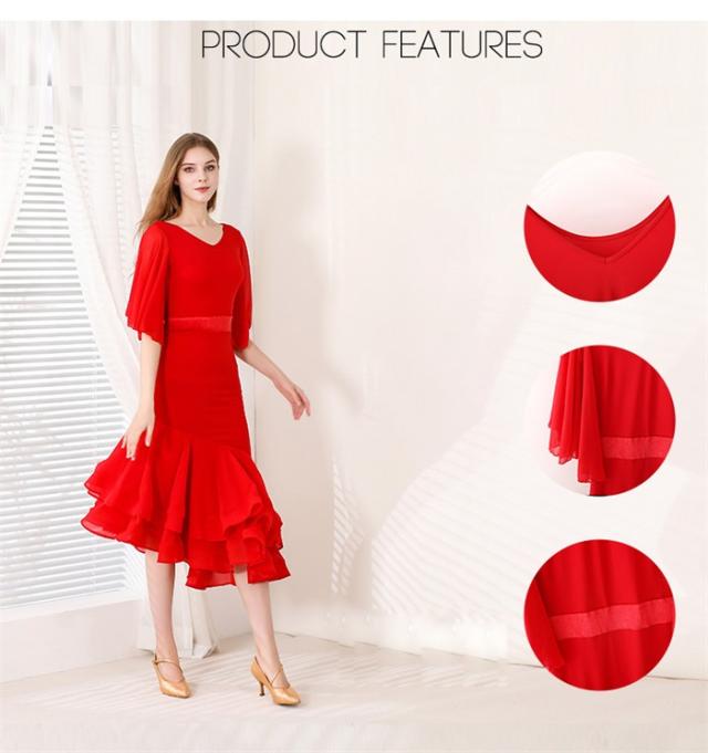社交ダンスドレス モダンドレス 赤 レッド 社交ダンス衣装 社交ダンス レッドドレス ミモレ丈 スタンダードドレス ワルツダンス ステージ衣装 ダンス衣装 ダンスウェア 競技会 パーティー 発表会 競技着 練習着 舞台 演奏会 演出