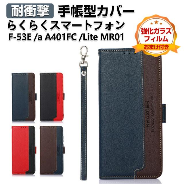 FCNT らくらくスマートフォン F-53E /a A401FC /Lite MR01 ケース カバー 耐衝撃 財布型 TPU&PUレザー ストラップ付き スタンド機能 カード収納 便利性の高い 人気 ストラップホール付き 手帳型カバー CASE 強化ガラスフィルム おまけ付き