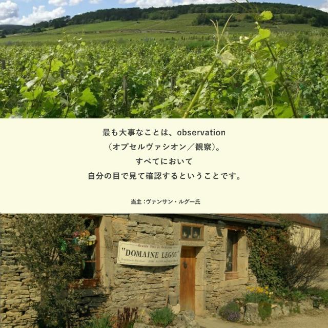 2006年、都合8年間務めたDRC社を退社した彼は、ヴォーヌ・ロマネ村から畑を上がった隣村コンクールに所在する父のドメーヌに戻って土壌改良などを行った後、2008年、正式にドメーヌを継承して本格的に自社ビン詰めを開始。ここに、「ドメーヌ・ヴァンサン・ルグー」が誕生しました