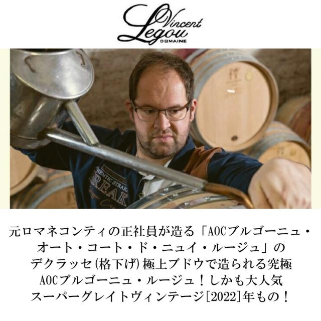 元ロマネコンティの正社員が造る「AOCブルゴーニュ・ オート・コート・ド・ニュイ・ルージュ」の デクラッセ(格下げ)極上ブドウで造られる究極 AOCブルゴーニュ・ルージュ!しかも大人気 スーパーグレイトヴィンテージ[2022]年もの!