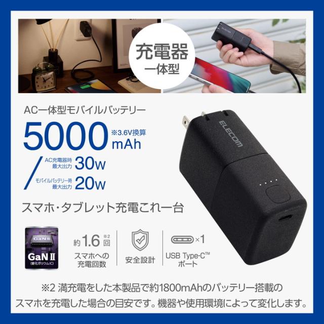 エレコム モバイルバッテリー AC充電器一体 C×1 5000mAh 30W USB-C入出力×1 リチウムイオン電池 AC一体型 USB パワーデリバリー Type-C PSE適合 ブラック┃DE-AC09-5000BK