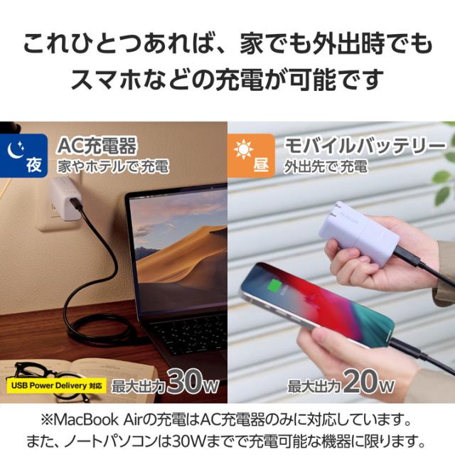 エレコム モバイルバッテリー AC充電器一体 C×1 5000mAh 30W USB-C入出力×1 リチウムイオン電池 AC一体型 USB パワーデリバリー Type-C PSE適合 パープル┃DE-AC09-5000PU