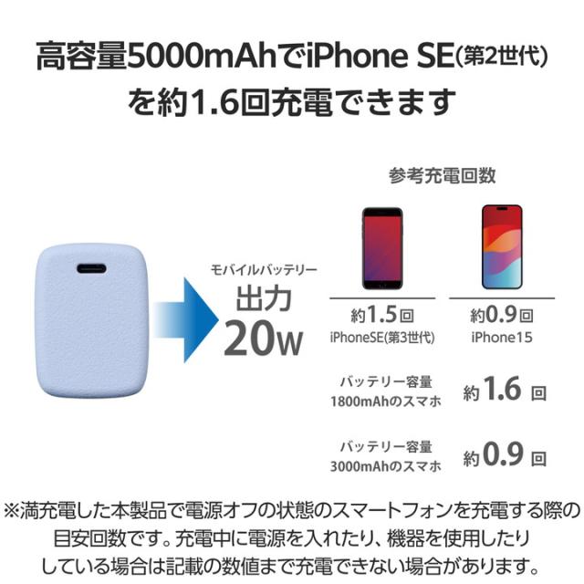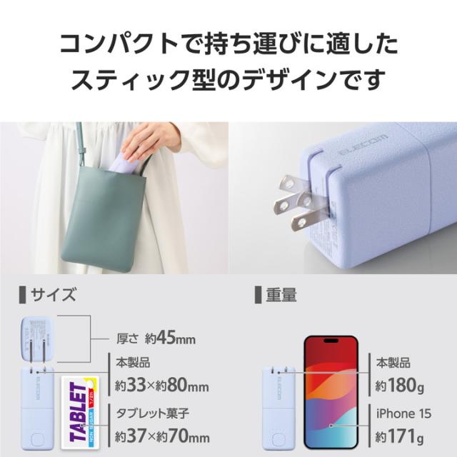 AC充電器としてもモバイルバッテリーとしても使用可能な2in1タイプ!ポーチやポケットにすっぽり収まる手のひらサイズ。5000mAhのAC充電器一体型モバイルバッテリーです。![]() ■1台2役で使える、USB Power Delivery AC充電器一体型モバイルバッテリーです。 ■ポーチや小さなバッグ、ポケットにもすっぽり収まる手のひらサイズ。出張や旅行時はもちろん、ちょっとしたお出かけの際も気軽に持ち運べます。 ■モバイルバッテリー使用時最大出力20Wだから、スマートフォンを高速充電可能。外出先での急な充電切れの際も安心です。 ■本製品をコンセントに挿した状態でスマートフォンを接続することで、AC充電器としても使えます。 ■AC充電器として30Wの出力が可能。スマートフォンやタブレットはもちろん、Macbook Airなどのノートパソコンも充電できます。 ■※30Wまでで充電可能なノートパソコンに限ります。 ■本製品とスマートフォンを同時に接続することでまとめて充電できる“まとめて充電”に対応しています。 ■※スマートフォンへ優先的に充電されます。スマートフォンの充電が完了すると本製品に充電されます。 ■コンセントに挿すだけで本製品を直接充電可能。本製品は約2時間30分で充電できます。 ■※本製品のみを充電した場合の目安時間です。 ■電源プラグ部分にはスイングプラグ機構を採用。回転させて本体に収納できるためスマートに持ち運べます。 ■本製品(バッテリー容量5000mAh)で、1800mAhのスマートフォンを約1.6回、3000mAhのスマートフォンを約0.9回充電可能です。 ■※満充電した本製品で電源オフの状態のスマートフォンを充電する際の目安回数です。充電中に電源を入れたり、機器を使用したりしている場合は記載の数値まで充電できない場合があります。 ■電池残量は4段階のLEDランプ点灯で確認できます。 ■約500回繰り返し使用可能な充電式リチウムイオン電池を搭載しています。 ■内蔵の充電式リチウムイオン電池は、JIS C8711およびJIS C8712(JIS C8714の内容を含む)に準拠した安全設計です。 ■日本の電気用品安全法(PSE)の技術基準に適合した安全性の高い商品です。 ■過充電・過放電・過電流防止機能および短絡保護機能と温度検知機能の5つの保護機能を備えた安心の回路設計です。 ■電池容量が160Wh(43,243mAh)以下であるため、機内持ち込みも可能です。 ※航空会社の規定によって例外がある場合があります。 ■※工場出荷時に70%程度充電されています。充電式リチウムイオン電池は時間とともに放電するので、ご使用になる前に充電することを推奨します。 ■※ケーブルを挿したままにするとバッテリーの残量が減ってしまいます。使用しない場合は必ずケーブルを外してください。 ■※本製品とスマートフォンを接続するケーブルは付属していません。 ■※USB Type-C and USB-C are trademarks of USB Implementers Forum. ■本製品は、一般社団法人JBRCの回収対象製品であり、回収協力自治体や協力店(家電量販店・ホームセンターなど)で回収が可能です。 ■※JBRCのホームページでお住まいの地域の回収協力自治体・協力店をご確認ください。 ■自社環境認定基準を1つ以上満たし、『THINK ECOLOGY』マークを表示した製品です。 ■環境保全に取り組み、製品本体の主たる構成部品や構成要素の原料に占めるリサイクル原料の割合が10%を超えている製品です。 ■環境保全に取り組み、製品の包装容器におけるプラスチック重量を、社内基準製品より20%以上削減した製品です。 ■環境保全に取り組み、製品の包装容器が紙・ダンボール・ポリ袋のみで構成されている製品です。 ![]() ■対応機種:iPhoneおよびUSB端子で充電するパソコン、スマートフォン、タブレット、他小型電子機器 ■定格入力電圧:AC:100-240V 50/60Hz、USB Type-C:5V ■定格入力電流:AC:1A、USB Type-C:2.4A ■コネクター形状(電源出力側):USB Type-C(TM)ポート×1 ■定格出力電圧1:AC充電器として使用時:USB Type-C:5V/9V/12V/15V/20V ■定格出力電圧2:モバイルバッテリーとして使用時:USB Type-C:5V/9V ■定格出力電流1:AC充電器として使用最大出力30W USB Type-C:5V時3A/9V時3A/12V時2.5A/15V時2A・20V時1.5A ■定格出力電流2:モバイルバッテリーとして使用時最大出力20W USB Type-C:5V時3A/9V時2.22A ■電池種類:充電式リチウムイオン電池 ■電池定格容量:3.6V/5000mAh 18.0Wh ■充電時間:約2時間30分 ※製品本体のみを充電した場合の目安です。スマートフォンなどのモバイル機器を接続した場合は記載の時間では充電できません。 ■外形寸法:幅約80mm×奥行約33mm×高さ約45mm ■重量:約180g ■カラー:パープル ■くり返し使用回数:500回 ■環境配慮事項:使用温度:0〜40℃ ■電気用品安全法:○PSE 特定以外の電気用品 ◇PSE 特定電気用品 ■保証期間:1年間 ■その他:Lightningポート搭載の端末で使用する場合は別途Lightningプラグのケーブルをご用意ください。 |