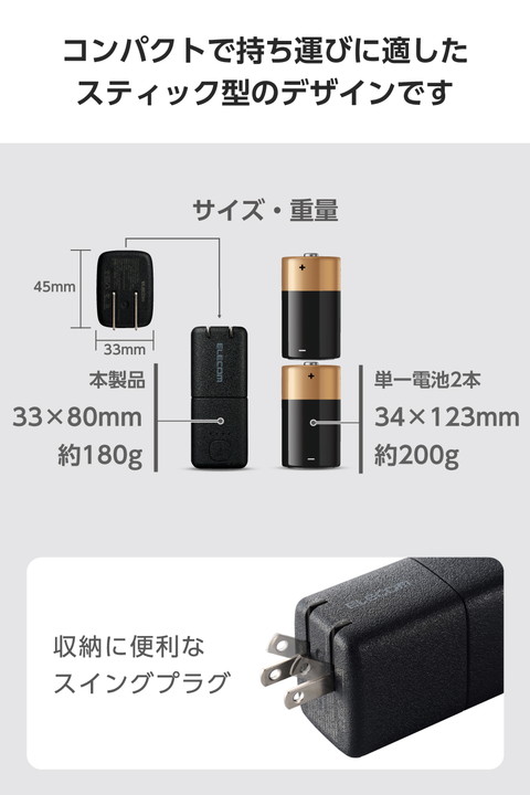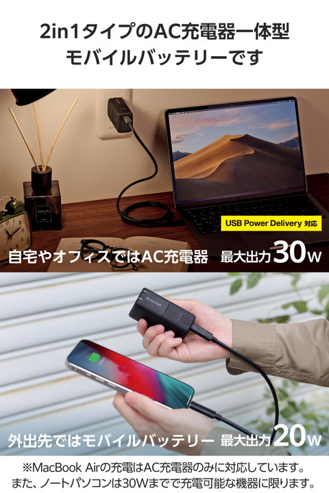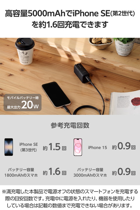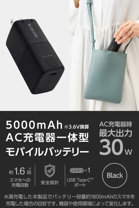 AC充電器としてもモバイルバッテリーとしても使用可能な2in1タイプ!ポーチやポケットにすっぽり収まる手のひらサイズ。5000mAhのAC充電器一体型モバイルバッテリーです。![]() ■1台2役で使える、USB Power Delivery AC充電器一体型モバイルバッテリーです。 ■ポーチや小さなバッグ、ポケットにもすっぽり収まる手のひらサイズ。出張や旅行時はもちろん、ちょっとしたお出かけの際も気軽に持ち運べます。 ■モバイルバッテリー使用時最大出力20Wだから、スマートフォンを高速充電可能。外出先での急な充電切れの際も安心です。 ■本製品をコンセントに挿した状態でスマートフォンを接続することで、AC充電器としても使えます。 ■AC充電器として30Wの出力が可能。スマートフォンやタブレットはもちろん、Macbook Airなどのノートパソコンも充電できます。 ■※30Wまでで充電可能なノートパソコンに限ります。 ■本製品とスマートフォンを同時に接続することでまとめて充電できる“まとめて充電”に対応しています。 ■※スマートフォンへ優先的に充電されます。スマートフォンの充電が完了すると本製品に充電されます。 ■コンセントに挿すだけで本製品を直接充電可能。本製品は約2時間30分で充電できます。 ■※本製品のみを充電した場合の目安時間です。 ■電源プラグ部分にはスイングプラグ機構を採用。回転させて本体に収納できるためスマートに持ち運べます。 ■本製品(バッテリー容量5000mAh)で、1800mAhのスマートフォンを約1.6回、3000mAhのスマートフォンを約0.9回充電可能です。 ■※満充電した本製品で電源オフの状態のスマートフォンを充電する際の目安回数です。充電中に電源を入れたり、機器を使用したりしている場合は記載の数値まで充電できない場合があります。 ■電池残量は4段階のLEDランプ点灯で確認できます。 ■約500回繰り返し使用可能な充電式リチウムイオン電池を搭載しています。 ■内蔵の充電式リチウムイオン電池は、JIS C8711およびJIS C8712(JIS C8714の内容を含む)に準拠した安全設計です。 ■日本の電気用品安全法(PSE)の技術基準に適合した安全性の高い商品です。 ■過充電・過放電・過電流防止機能および短絡保護機能と温度検知機能の5つの保護機能を備えた安心の回路設計です。 ■電池容量が160Wh(43,243mAh)以下であるため、機内持ち込みも可能です。 ※航空会社の規定によって例外がある場合があります。 ■※工場出荷時に70%程度充電されています。充電式リチウムイオン電池は時間とともに放電するので、ご使用になる前に充電することを推奨します。 ■※ケーブルを挿したままにするとバッテリーの残量が減ってしまいます。使用しない場合は必ずケーブルを外してください。 ■※本製品とスマートフォンを接続するケーブルは付属していません。 ■※USB Type-C and USB-C are trademarks of USB Implementers Forum. ■本製品は、一般社団法人JBRCの回収対象製品であり、回収協力自治体や協力店(家電量販店・ホームセンターなど)で回収が可能です。 ■※JBRCのホームページでお住まいの地域の回収協力自治体・協力店をご確認ください。 ■自社環境認定基準を1つ以上満たし、『THINK ECOLOGY』マークを表示した製品です。 ■環境保全に取り組み、製品本体の主たる構成部品や構成要素の原料に占めるリサイクル原料の割合が10%を超えている製品です。 ■環境保全に取り組み、製品の包装容器におけるプラスチック重量を、社内基準製品より20%以上削減した製品です。 ■環境保全に取り組み、製品の包装容器が紙・ダンボール・ポリ袋のみで構成されている製品です。 ![]() ■対応機種:iPhoneおよびUSB端子で充電するパソコン、スマートフォン、タブレット、他小型電子機器 ■定格入力電圧:AC:100-240V 50/60Hz、USB Type-C:5V ■定格入力電流:AC:1A、USB Type-C:2.4A ■コネクター形状(電源出力側):USB Type-C(TM)ポート×1 ■定格出力電圧1:AC充電器として使用時:USB Type-C:5V/9V/12V/15V/20V ■定格出力電圧2:モバイルバッテリーとして使用時:USB Type-C:5V/9V ■定格出力電流1:AC充電器として使用最大出力30W USB Type-C:5V時3A/9V時3A/12V時2.5A/15V時2A・20V時1.5A ■定格出力電流2:モバイルバッテリーとして使用時最大出力20W USB Type-C:5V時3A/9V時2.22A ■電池種類:充電式リチウムイオン電池 ■電池定格容量:3.6V/5000mAh 18.0Wh ■充電時間:約2時間30分 ※製品本体のみを充電した場合の目安です。スマートフォンなどのモバイル機器を接続した場合は記載の時間では充電できません。 ■外形寸法:幅約80mm×奥行約33mm×高さ約45mm ■重量:約180g ■カラー:ブラック ■くり返し使用回数:500回 ■環境配慮事項:使用温度:0〜40℃ ■電気用品安全法:○PSE 特定以外の電気用品 ◇PSE 特定電気用品 ■保証期間:1年間 ■その他:Lightningポート搭載の端末で使用する場合は別途Lightningプラグのケーブルをご用意ください。 |