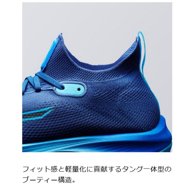 柔らかいニットアッパーがランナーの足にやさしくなじみ、包み込む。 ブーティ構造のシームレスなアッパーはトレーニングに最適なフィット感を提供するとともに、 パーツ数を最小限にすることで軽量化にも貢献。
