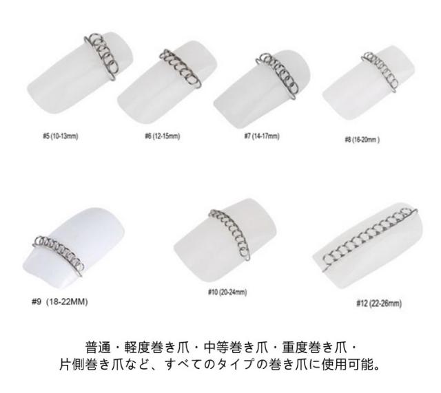 | サイズについての説明 | 【セットの内容】 矯正チエーン:2組セット(1組6本、共12本) 固定用テープ: 1巻 つけ具: 1本 【矯正チエーンのサイズ】 12−15mm x 2本 14−17mm x 2本 16−20mm x 2本 18−22mm x 2本 20−24mm x 2本 22−26mm x 2本 【サイズ選択の目安】 標準サイズ:16mm 男性(足の大きめの方):14mm/16mm 女性(足の小さめの方):16mm/18mm ※実際の爪表面の長さを参考にサイズ選定してください。迷った時は小さめが無難です ※疼痛が片側の場合は小さめのサイズを選、ぶの無難です(片側に寄せで使用できます) ※爪が厚い場合や変形が強い場合は小さめのサイズ選定が良いです(外側で急激に折れ曲 がっている爪を含む) ※形状的には16mmサイズが標準的で使いやすいです。 ※各サイズで若干形状(波形状の角度)が変化します。 |
