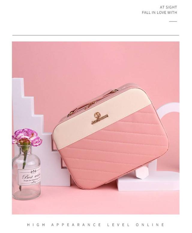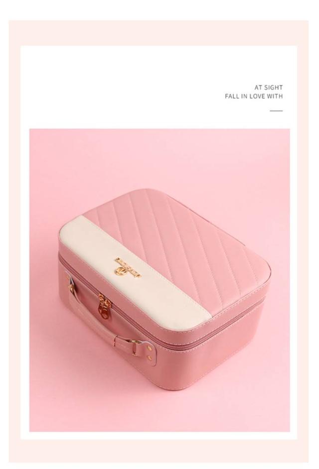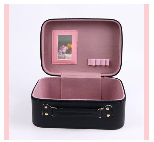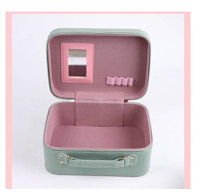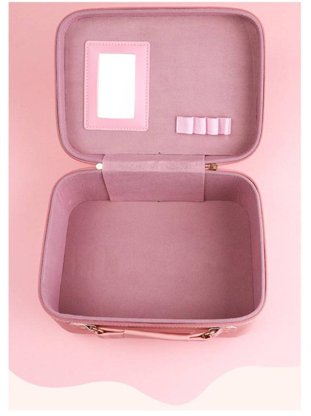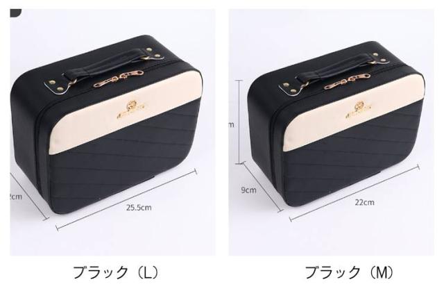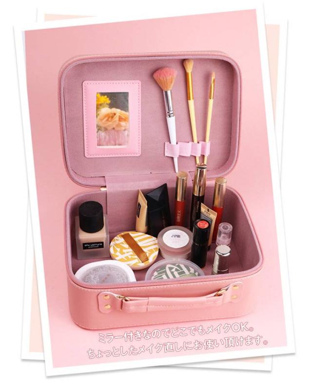 | メイクバッグ ミラー付 PU素材 持ち手も付いているので、旅行などの持ち運びもラクラク♪ ゴールドの金具が相まって高級感が漂います。 ミラー付きなのでどこでもメイクOK。ちょっとしたメイク直しにお使い頂けます。 お泊りや旅行先でのお化粧には絶対役に立つこと間違いなしです。 高さのあるボトルの収納は、寝かせて収納になりますが、旅行用のミニボトル(約6.10センチ位まで)などは立てて収納することが可能です。 撥水効果のあるPU素材のメイクバッグは、万が一水がかかってしまっても安心です。 | |