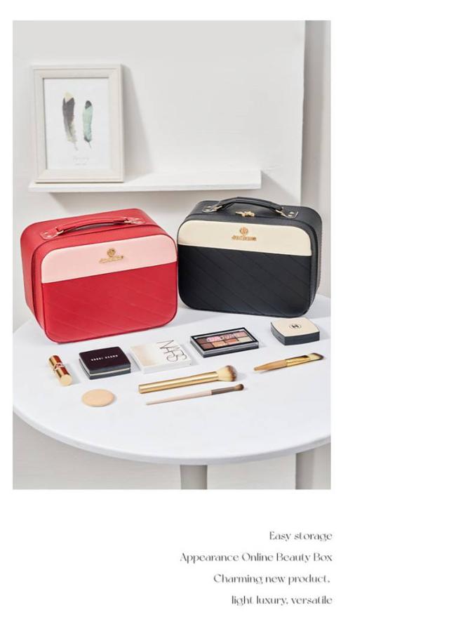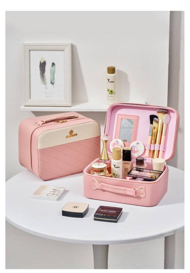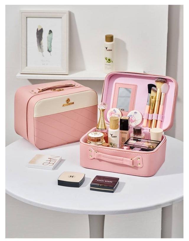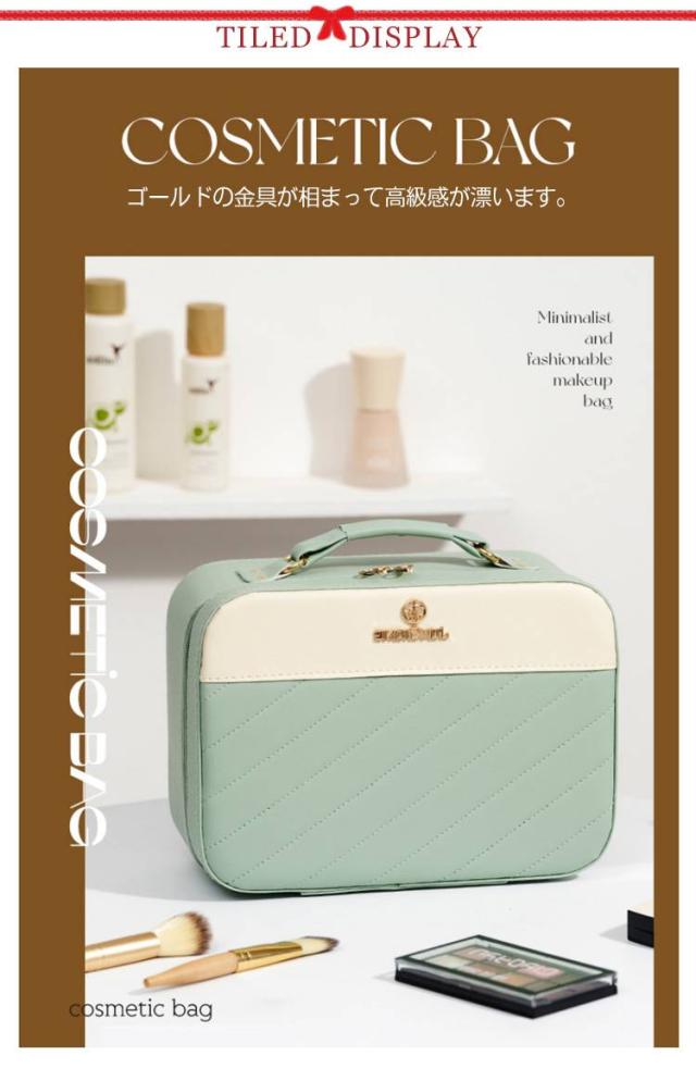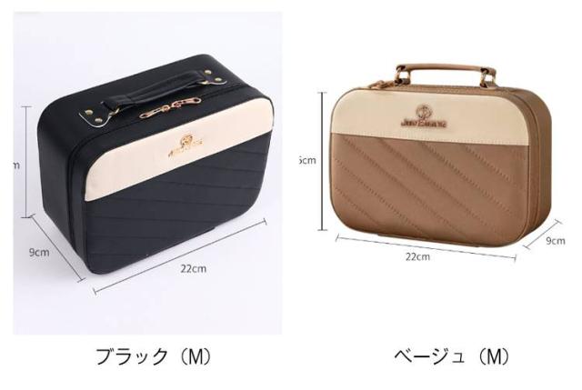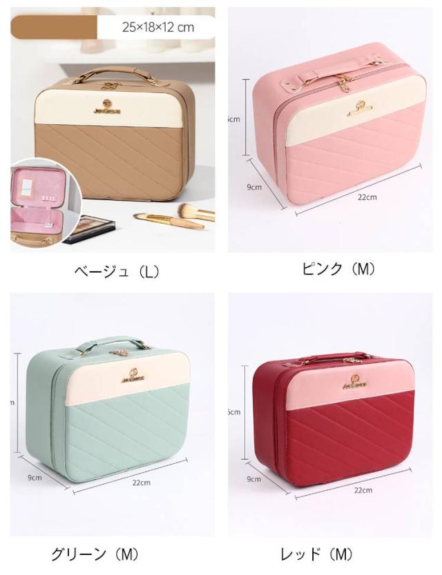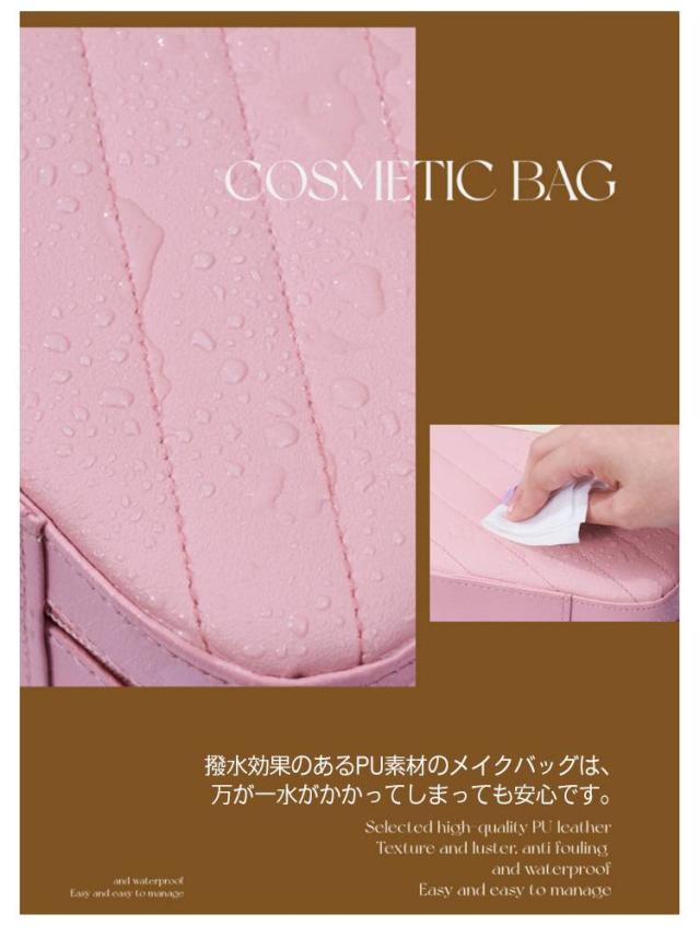 | メイクバッグ ミラー付 PU素材 持ち手も付いているので、旅行などの持ち運びもラクラク♪ ゴールドの金具が相まって高級感が漂います。 ミラー付きなのでどこでもメイクOK。ちょっとしたメイク直しにお使い頂けます。 お泊りや旅行先でのお化粧には絶対役に立つこと間違いなしです。 高さのあるボトルの収納は、寝かせて収納になりますが、旅行用のミニボトル(約6.9センチ位まで)などは立てて収納することが可能です。 撥水効果のあるPU素材のメイクバッグは、万が一水がかかってしまっても安心です。 | |