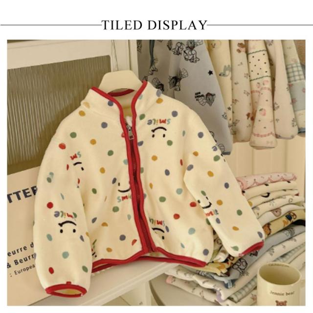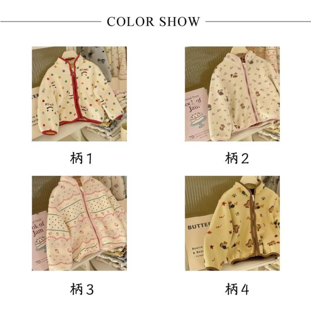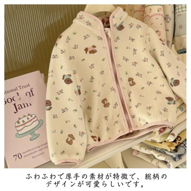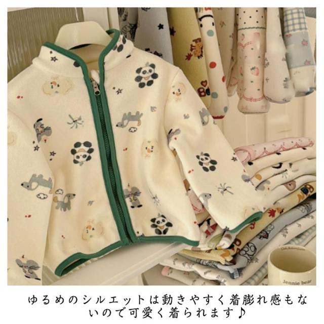 | この秋冬にぴったり!寒い朝晩や湯冷め対策に最適なフリースジャケット。 ふわふわで厚手の素材が特徴で、総柄のデザインが可愛らしいです。 ドット柄、パンダ、恐竜などの7種類から選べるので、お子様のお気に入りが見つかります。 アウターとしてはもちろんカーディガンの代わりとしても着やすい。 フードがないのですっきり着られて、園や学校でも活躍。 ゆるめのシルエットは動きやすく着膨れ感もないので可愛く着られます♪ | |