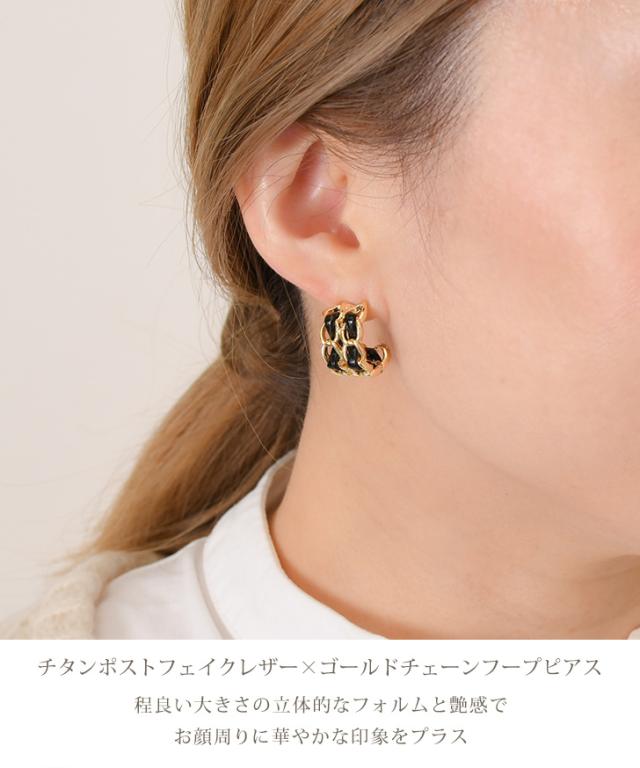 ●チタンポストフェイクレザー×ゴールドチェーンフープピアス