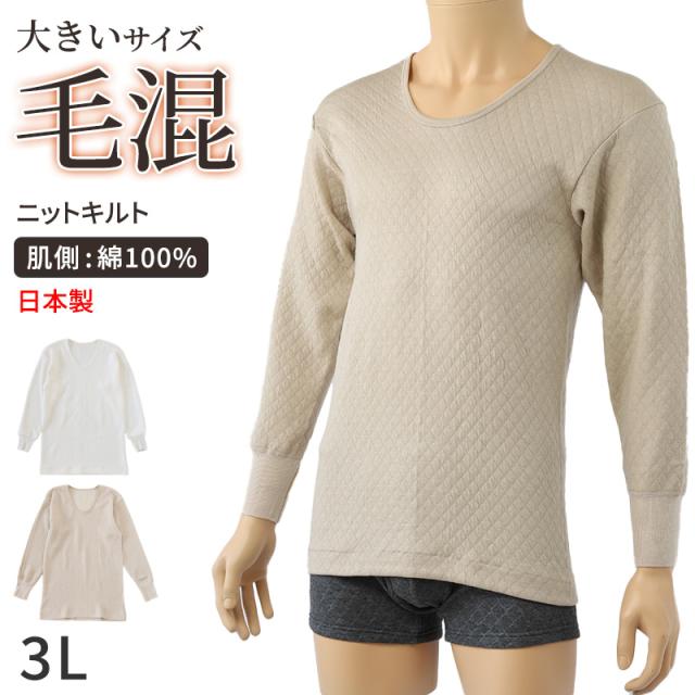 キルト 肌着 大きいサイズ メンズ U首 長袖 毛混 日本製 綿100 3L