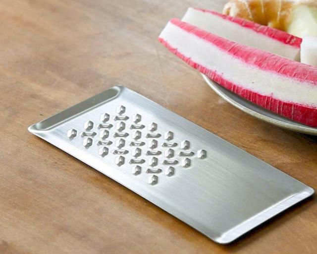 一般的なおろし金は受け皿とセットになっていますが、「トミタ式おろし金」は受け皿なしで使用できるので、洗い物が少なくすみます。また、厚みのないすっきりとしたデザインで、コンパクトに収納することが可能です。