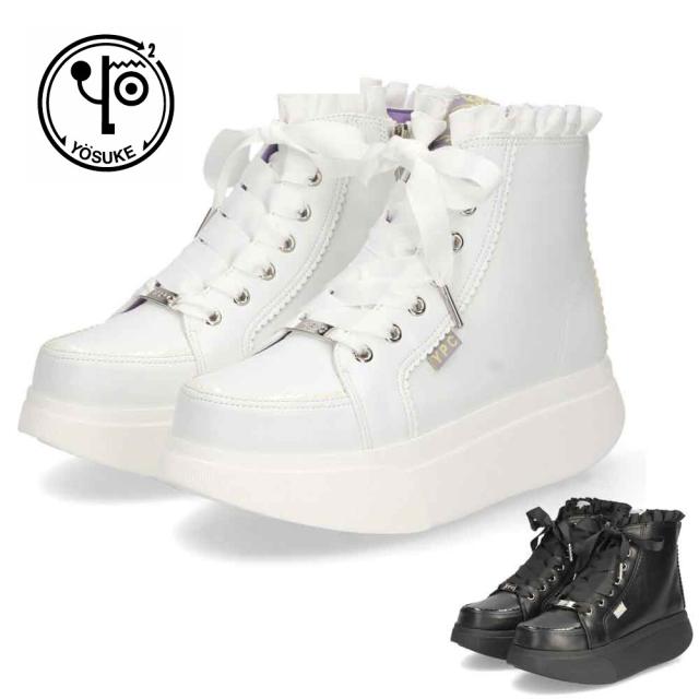 ヨースケ YOSUKE レディース 厚底スニーカー 3E 幅広 4450062 ホワイト ブラック 靴 5cm レースアップ フリル サテンリボン サイドジップ