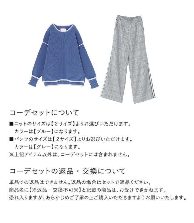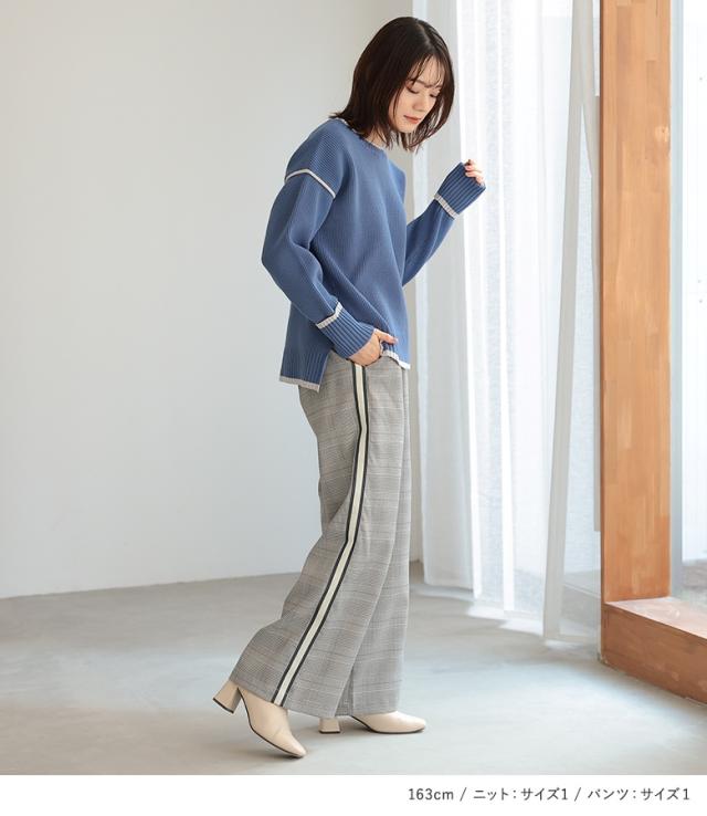 【送料無料】『配色ラインスポンジニット×サイドラインチェックパンツコーデ2点SET』【メール便不可】【50】[2点コーデセット 2024 レディース トップス ニット 配色ニット 長袖 ボトムス パンツ ワイドパンツ 柄]