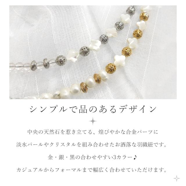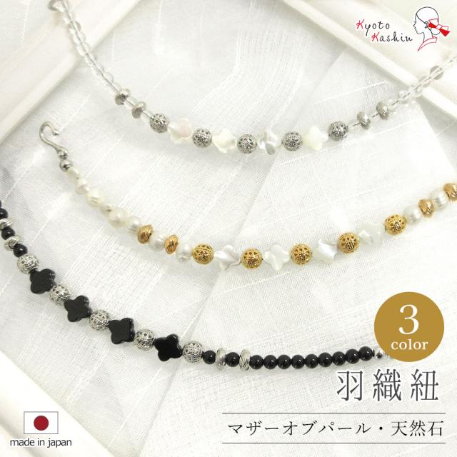 【メール便送料無料】羽織紐 日本製 天然石 マザーオブパール オニキス クリスタル ビーズ 貝殻 フック 約20cm 淡水パール 3色 金 銀 黒 ゴールド シルバー 和装小物 レディース 女性 通年用 お洒落 カジュアル フォーマル レース 羽織 色無地 訪問着 着物