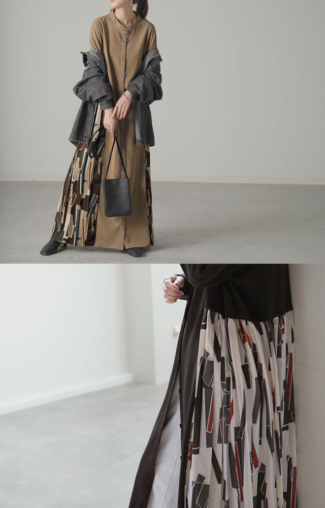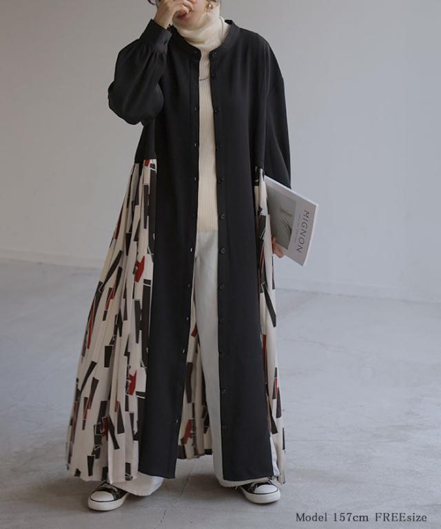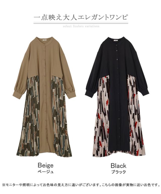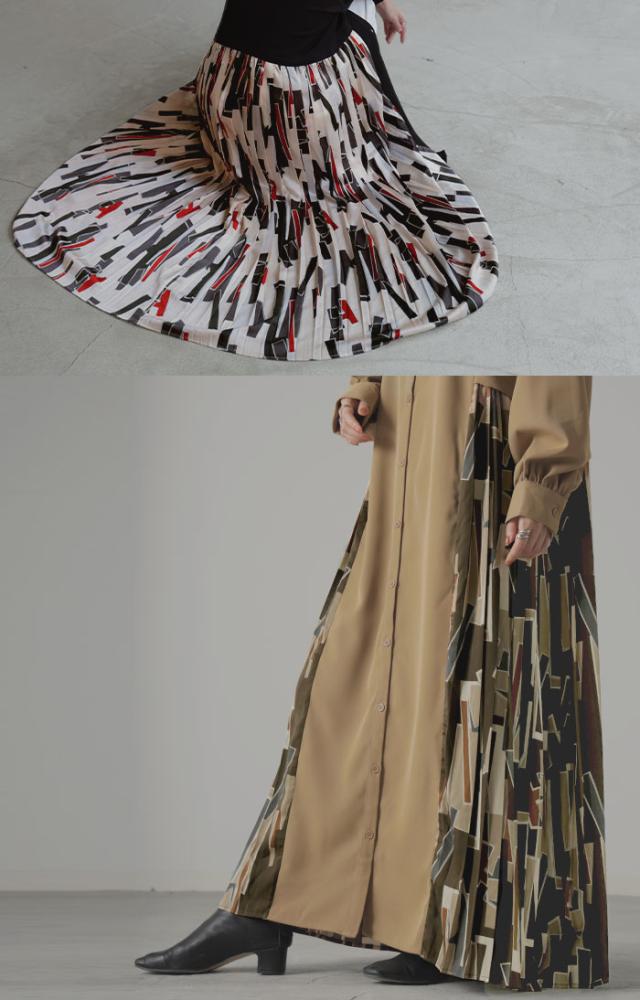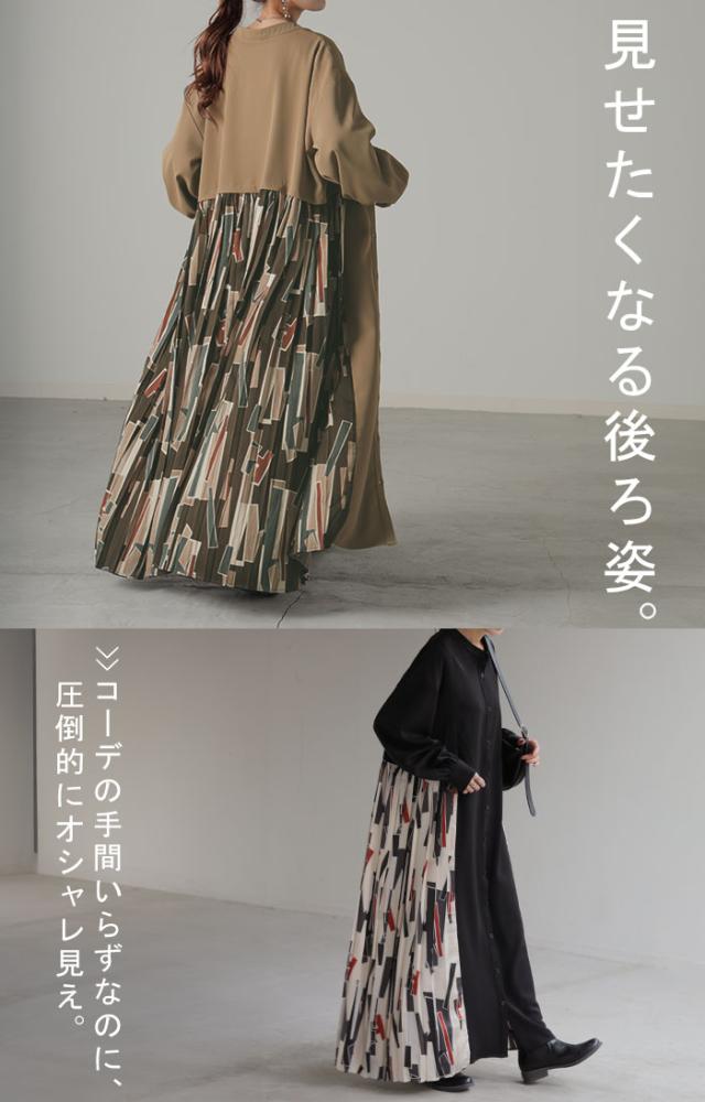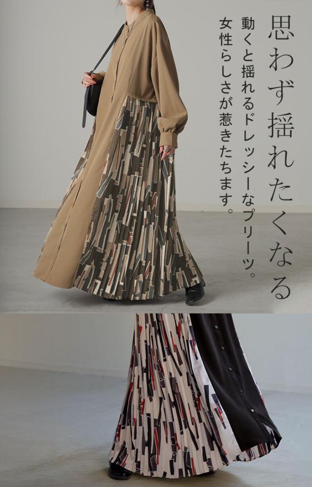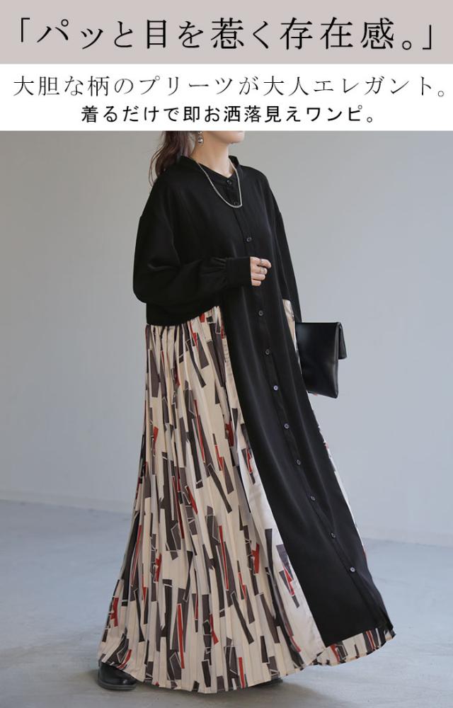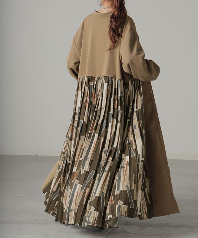 大胆な配色柄プリーツ切替デザインが特徴的なワンピースです。