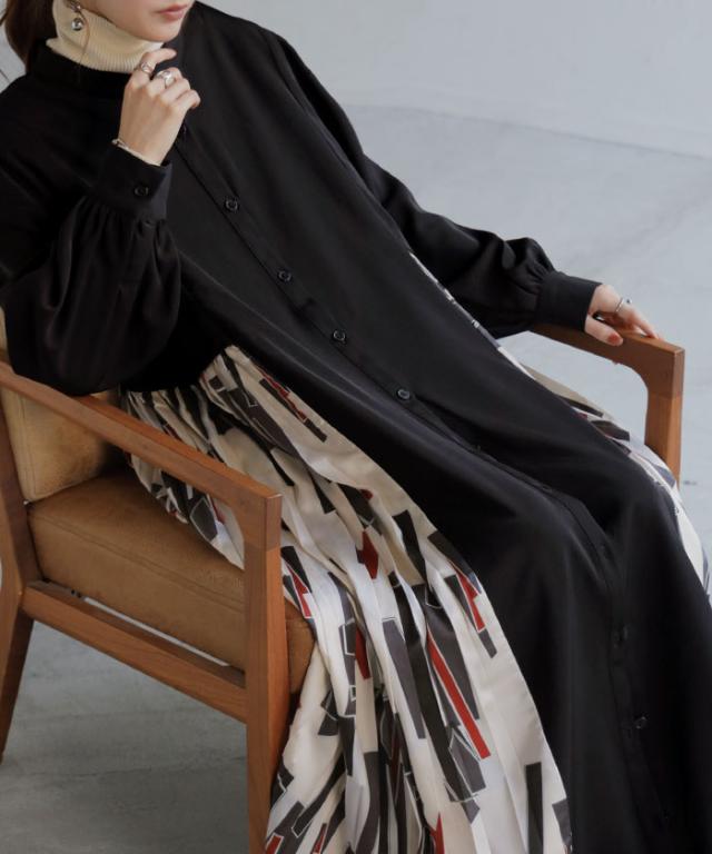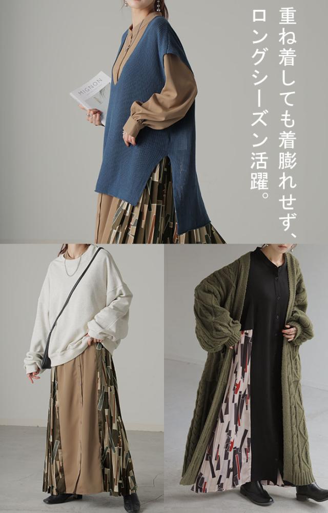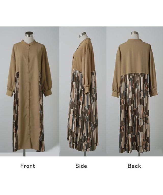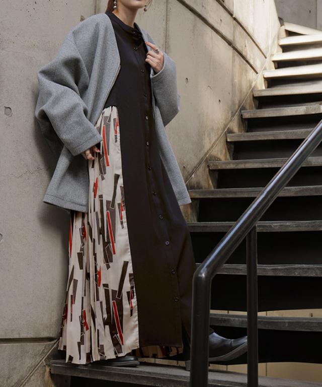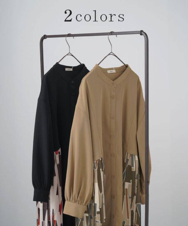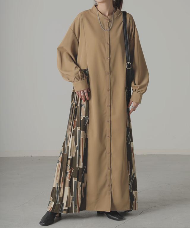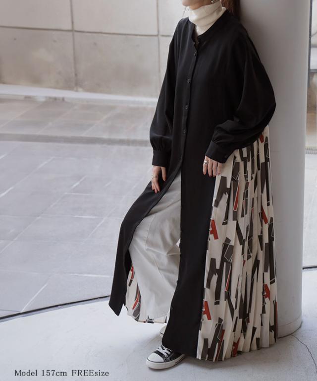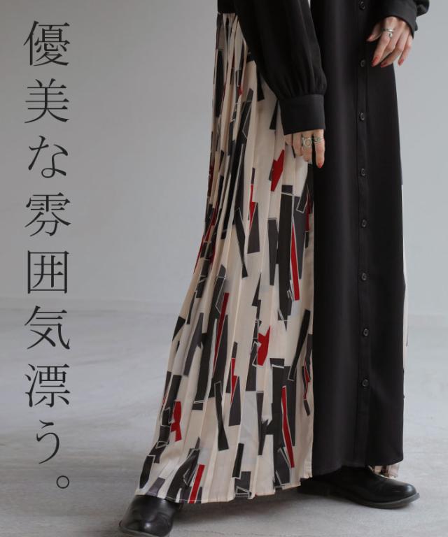 大胆な配色柄プリーツ切替デザインが特徴的なワンピースです。