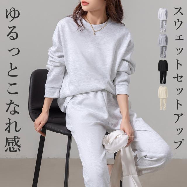 冬新作 「部屋着用・外出用にローテを組める」スウェット 上下 レディース 部屋着 パジャマ 長袖 2点セット プルオーバー クルーネック ドロップショルダー ストレート ポケット ウエストゴム ダブルフェイス 無地 杢 中厚手 黒 秋冬