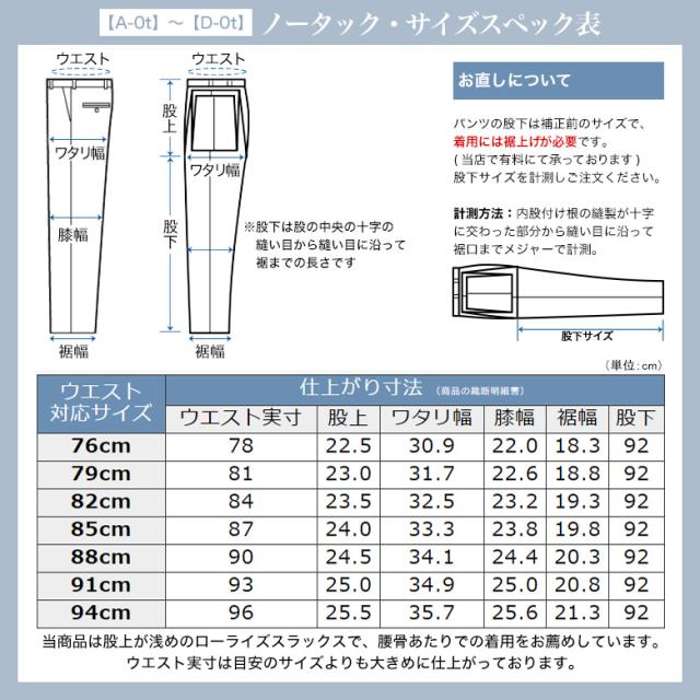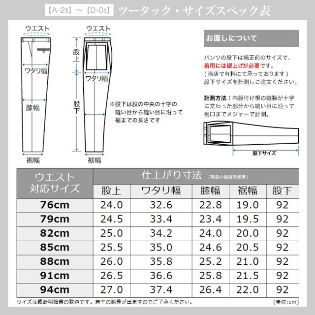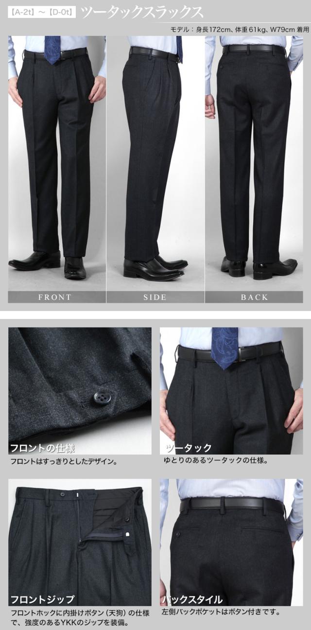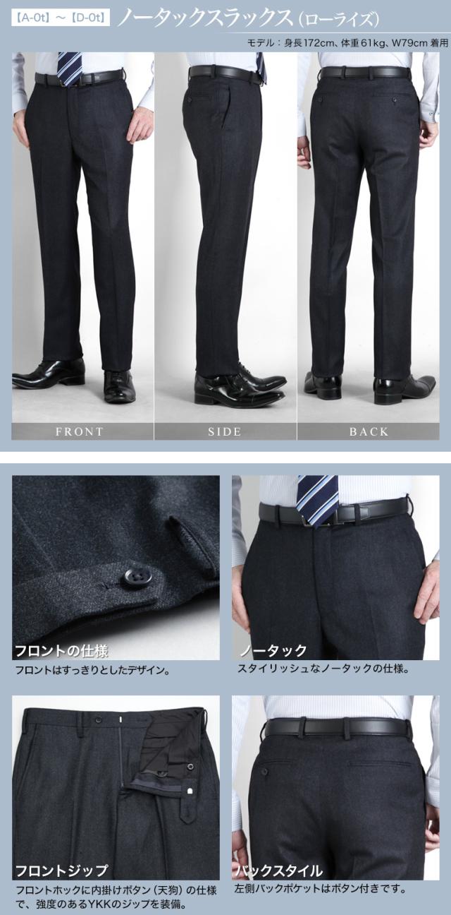 | ▼【A-0t】〜【D-0t】 ・ノータック ・ローライズ ・膝裏付き ・スリットポケット(サイドポケット) ・左側バックポケットはボタン付き ▼【A-2t】〜【D-2t】 ・ツータック ・膝裏付き ・スリットポケット(サイドポケット) ・左側バックポケットはボタン付き |