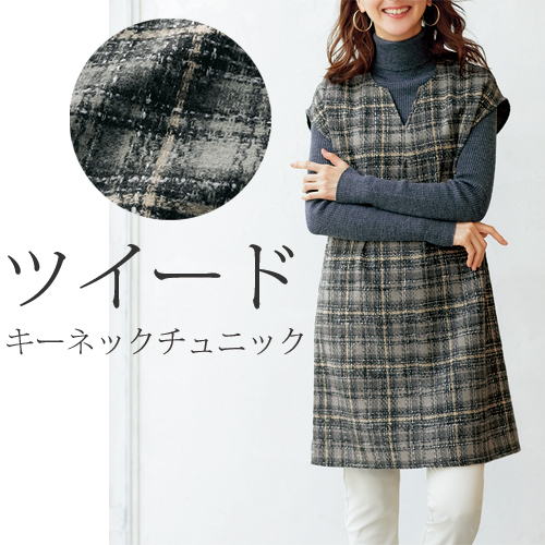 チェックツイードキーネックチュニック グレー チェック チュニック 半袖 ベスト レディース 婦人服 ミセス シニア 女性 体型カバー おしゃれ 重ね着 シンプル 上品 カジュアル 大人かわいい シニアファッション 40代 50代 60代 70代 80代 母の日 お母さん おばあちゃん 秋冬