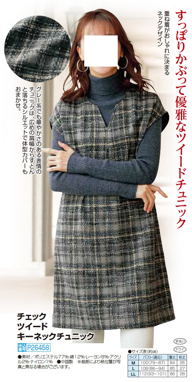 チェックツイードキーネックチュニック グレー チェック チュニック 半袖 ベスト レディース 婦人服 ミセス シニア 女性 体型カバー おしゃれ 重ね着 シンプル 上品 カジュアル 大人かわいい ファッション 40代 50代 60代 70代 80代 母の日 お母さん 秋冬 nss p26458