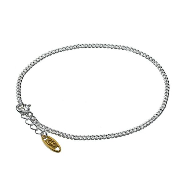 様々なスタイルに合う、喜平チェーンのシルバーブレスレット。さらりと着けやすい2mm幅タイプです。喜平チェーンは平らな面によるなめらかな輝きと存在感が人気のチェーン。繊細な輝きが魅力のシルバー925製チェーンに、K18ゴールドコーティングを施したブランドロゴチャームがアクセントになり高級感を演出します。アジャスターで長さ調整ができ男性も女性もお着け頂けるので、ペアでの着用やプレゼントにも最適です。無駄を省いた洗練されたデザインが高級感のある手元に仕上げてくれます。