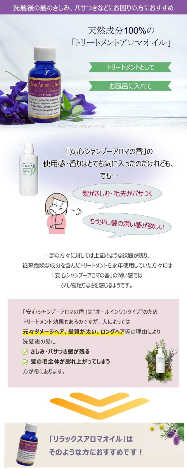 洗髪後に髪がきしむ、毛先がパサつく、もう少し髪の潤い感が欲しい…一部の方々に対しては上記のような課題が残り、従来危険な成分を含んだトリートメントを永年使用していた方々には「安心シャンプーアロマの香」の潤い感では少し物足りなさを感じるようです。