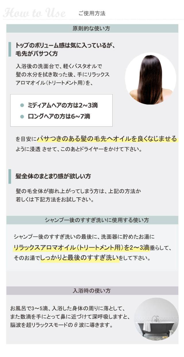 | 商品名 | リラックスアロマオイル 浴用&ヘアトリートメント用 | ||