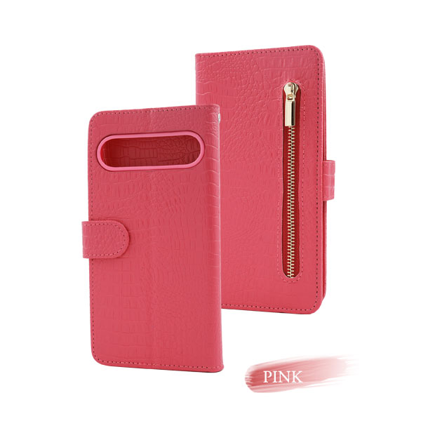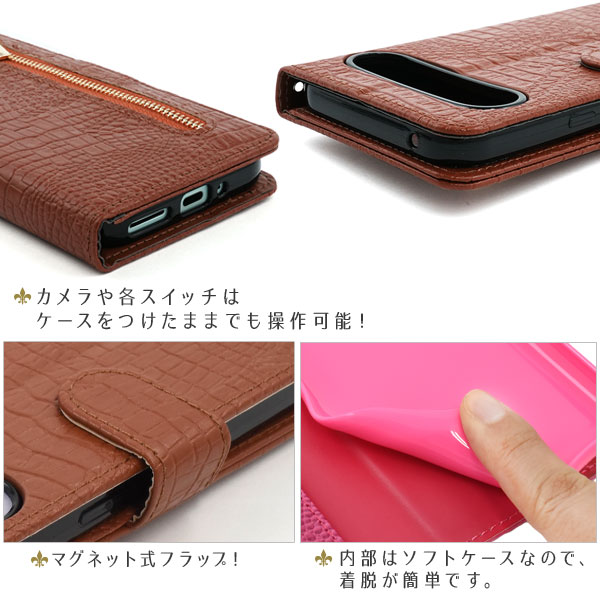 衝撃やキズなどからスマートフォンを守ります。 また、内部はソフトケースなので着脱が簡単です。 背面を折り返すとスタンドとして使用できるので、動画視聴に便利です。 横開きタイプなので、手帳のように使うことができます。 落下防止に最適なストラップホール付きです。 外側にファスナーポケットが付いているので、ちょっとした財布や小銭入れ代わりになって便利! また、内側に2つのカードポケットとサイドポケットが付いています。 高級感溢れるクロコダイルレザーデザイン。 ビジネスやカジュアルなど様々なシーンで活躍します。 | ||||||||||||||