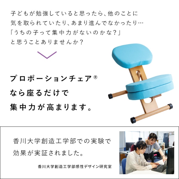 プロポーションチェア(R)なら座るだけで集中力が高まります。※香川大学創造工学部での実験で効果が実証されました。