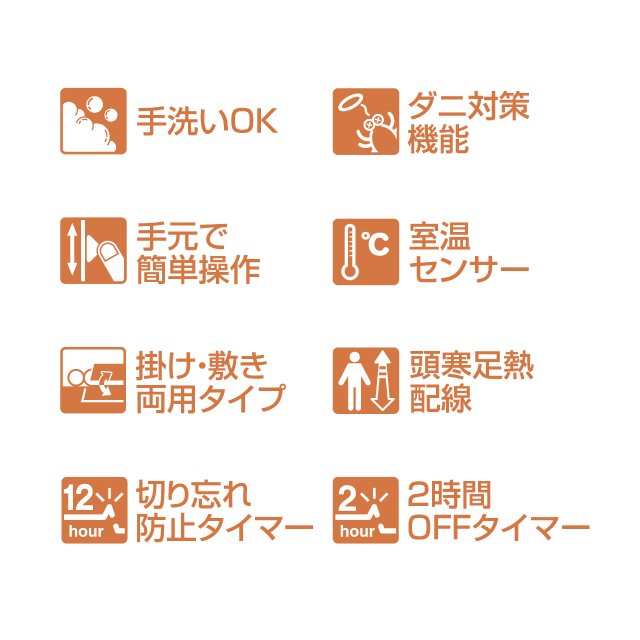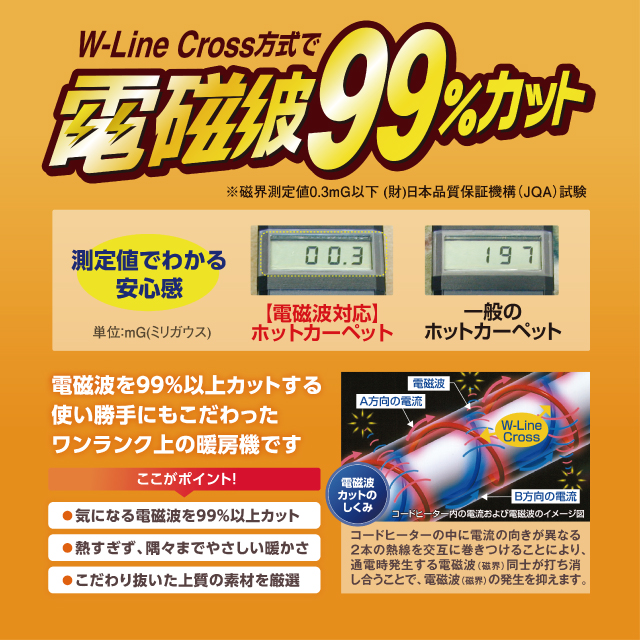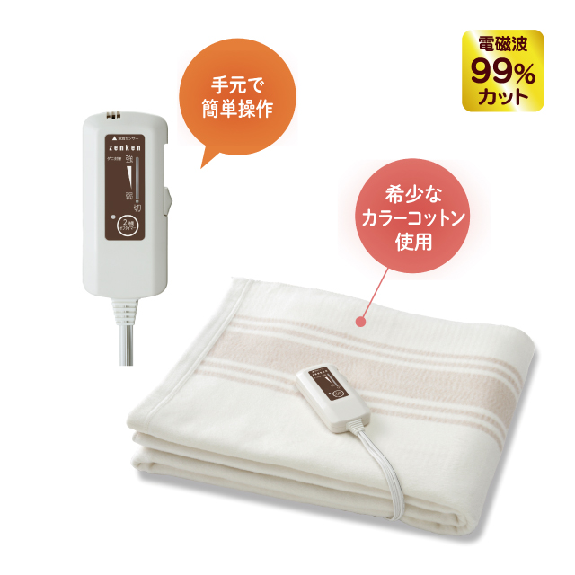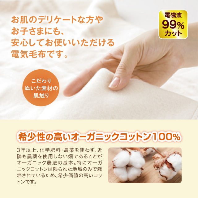 ・電磁波カットで安心な暖かさを電磁波を99%カットする独自のW-Line-Cross方式と自然素材のこだわる本物志向が融合し、新しい価値観を持った電気毛布です。
