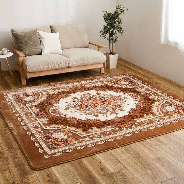 クラシカルな花柄デザインが、お部屋をあたたかみのある優雅な雰囲気に演出。部分的に施されたカービング加工によって立体感が生まれ、高級感のある仕上がりになっています。ウレタン入りでふっくらと厚みがあり、そのまま寝転がったり座布団がなくてもからだが痛くなりにくく、やさしい肌触りで心地よく快適に過ごせます。そのままご使用いただいても暖かいですが、さらに暖かくお使いいただけるようホットカーペット・床暖房対応。裏面は滑り止め付きでズレにくいのもうれしいポイントです。