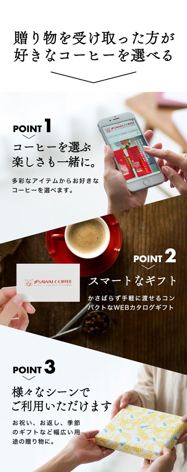| カード型WEBカタログギフトは、 贈る側も受け取る側もいいこといっぱい 澤井珈琲の「カード型WEBカタログギフト」なら、好きなコーヒーを選ぶ楽しさに加え、嬉しいポイントがいっぱい!コンパクトなので外出先でギフトを渡したいときにも便利。贈る側も受け取る側も嬉しいギフトです。 |