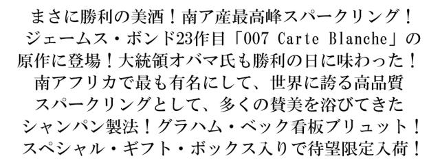 まさに勝利の美酒!南ア産最高峰スパークリング! ジェームス・ボンド23作目「007 Carte Blanche」の 原作に登場!大統領オバマ氏も勝利の日に味わった! 南アフリカで最も有名にして、世界に誇る高品質 スパークリングとして、多くの賛美を浴びてきた シャンパン製法!グラハム・ベック看板ブリュット! スペシャル・ギフト・ボックス入りで待望限定入荷!
