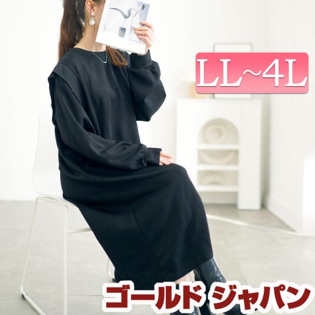 春新作 大きいサイズ レディース ワンピース 肩フリルスウェットワンピース ワンピ ロングワンピース ロング ラウンドネック 肩フリル ボリューム袖 Iライン ストレッチ 伸縮 スウェット シンプル カジュアル 無地 韓国 春服 秋服 LL 2L 3L 4L ブラック 黒 ゴ イベントセール