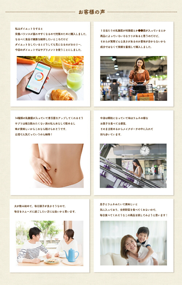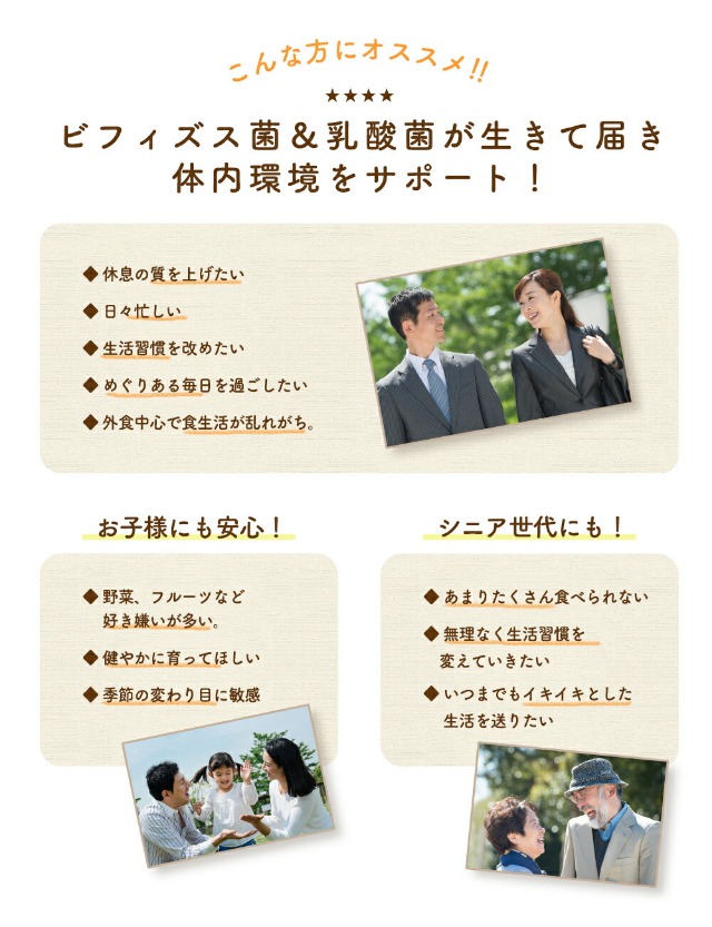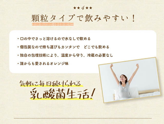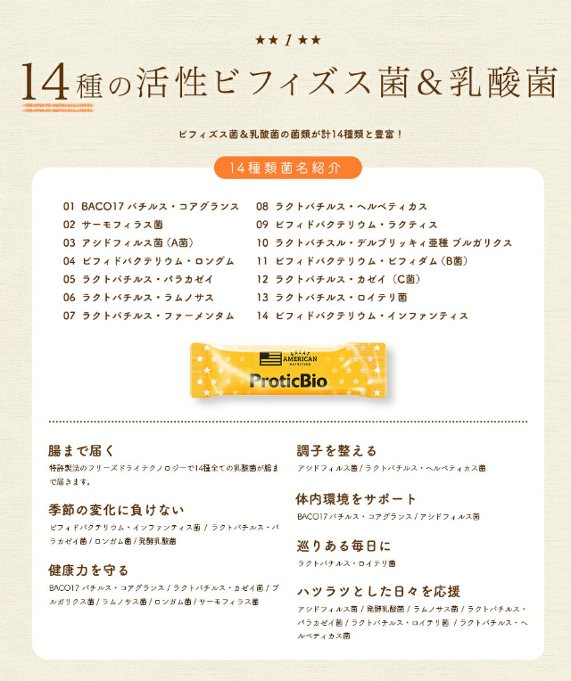 14種類の乳酸菌を贅沢に独自配合!顆粒タイプなので、水なしでいつでもどこでも手軽に飲めます。離乳食を始めたお子様からお召し上がりいただけます。【名称】乳酸菌・ビフィズス菌含有食品【内容量】3g×60包【お召し上がり方】食品として、1日1〜3包を目安にそのまま、又は水やぬるま湯などと共にお召し上がりください。【賞味期限】パッケージ側面に記載【保存方法】直射日光や高温多湿を避け、涼しい場所で保存してください。【栄養成分表示【1包(3g)当たり】■熱量:11.2kcal■たんぱく質:0g■脂質:0g■炭水化物:2.8g■食塩相当量:0.003g※この表示値は目安です。【区分】台湾製・健康食品【発売元、製造元、輸入元又は販売元】株式会社ウエルネスジャパン