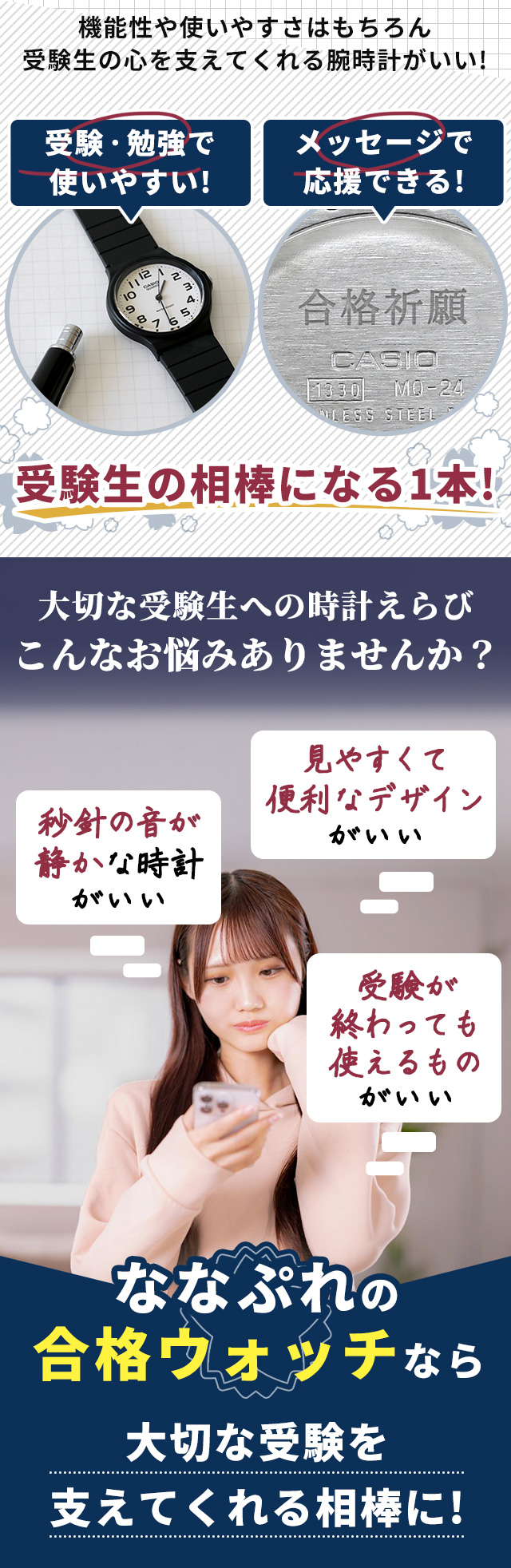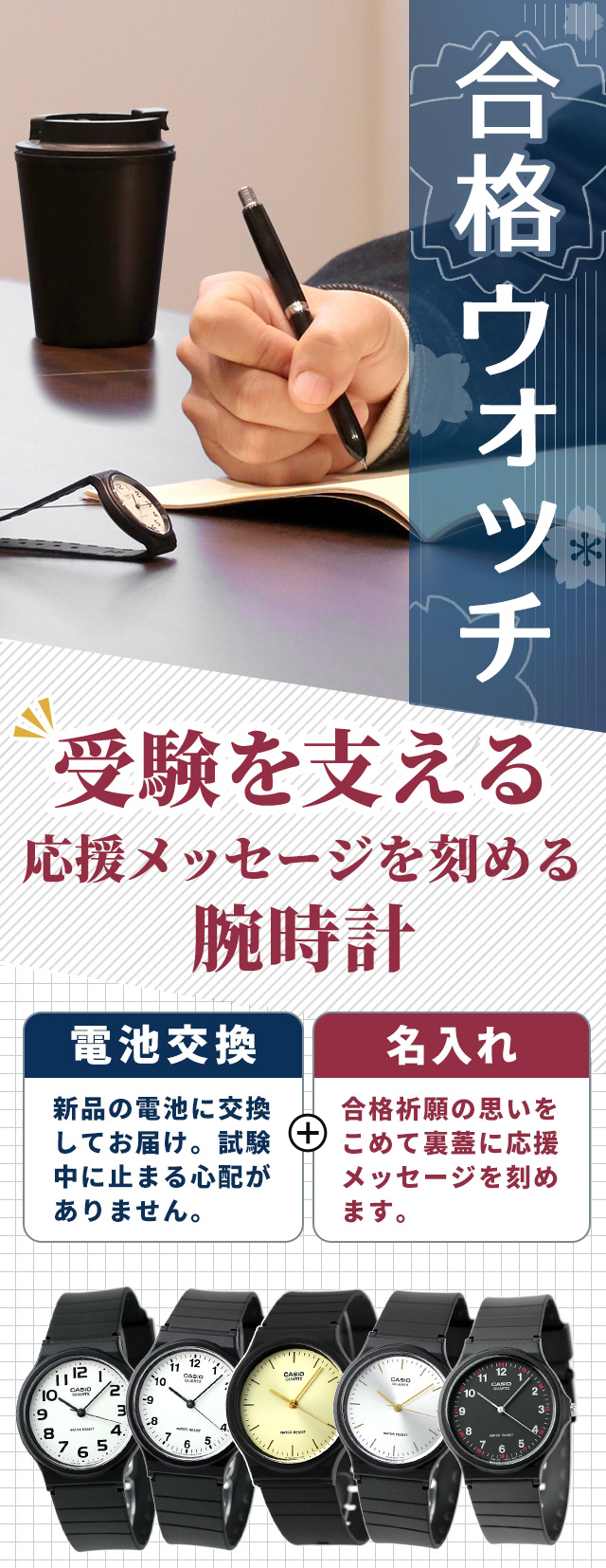 - 質問にも丁寧に対応してくださりありがとうございます。メッセージかわいかったです。電池交換もあり試験中に止まる心配しないで済みました。クリスマスラッピングの上に頂いた合格祈願を貼りました。春からこの時計...