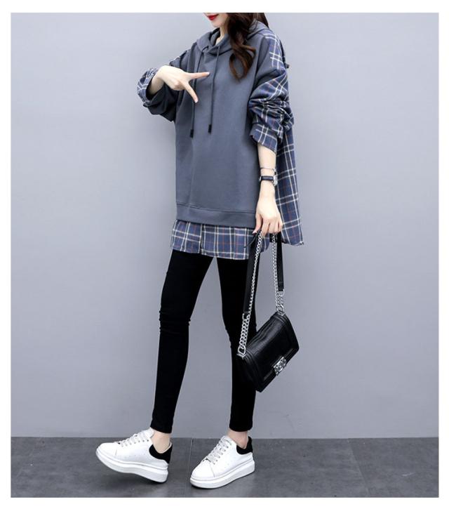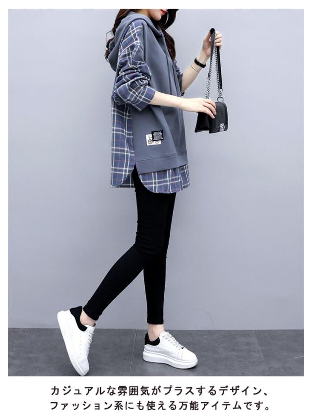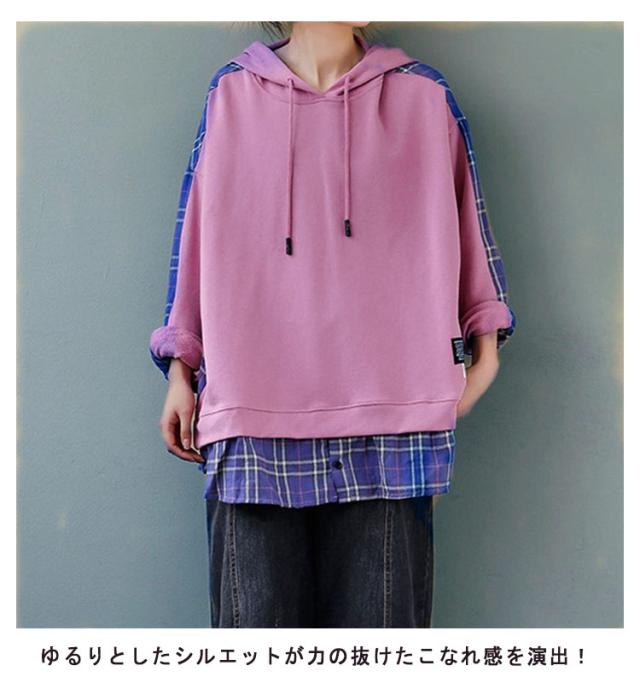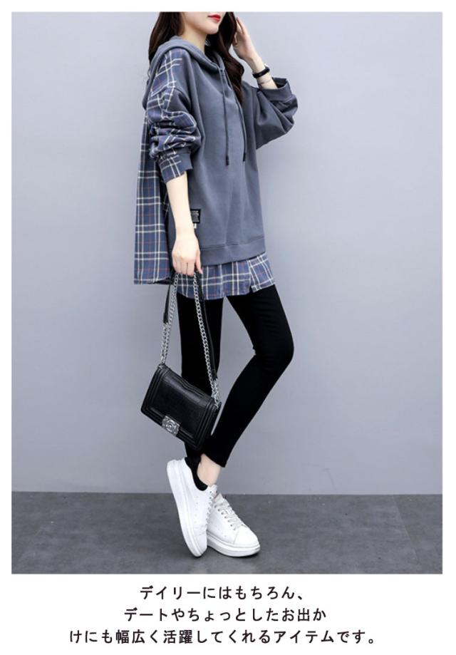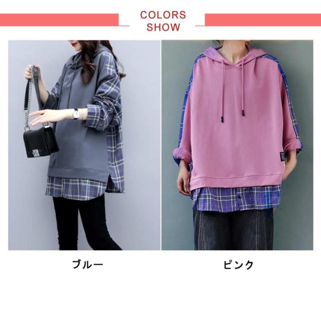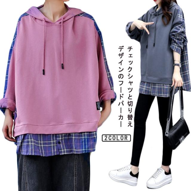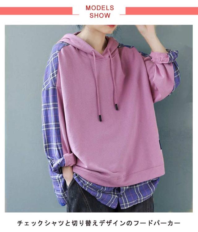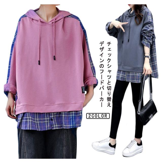 パーカー レディース 大きめ フーディー トレーナー プルオーバー スウェット フード フード付き tシャツ トップス スウェット 長袖 切り替え チェック柄 バックシャツ シンプル 大きいサイズ ゆったり 体型カバー 個性的 かわいい 春 秋 冬 送料無料