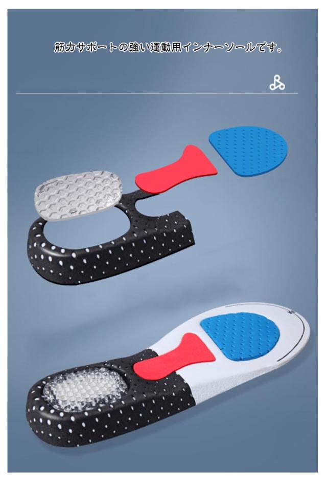 | スポーツインソール 高反発エアクッション カットフリー 筋力サポートの強い運動用インナーソールです。 表面メッシュ仕様、踵部分は深いカップ、シリコンクッションで衝撃吸收。 人体工学により安定性能アップします。 | |