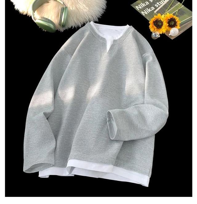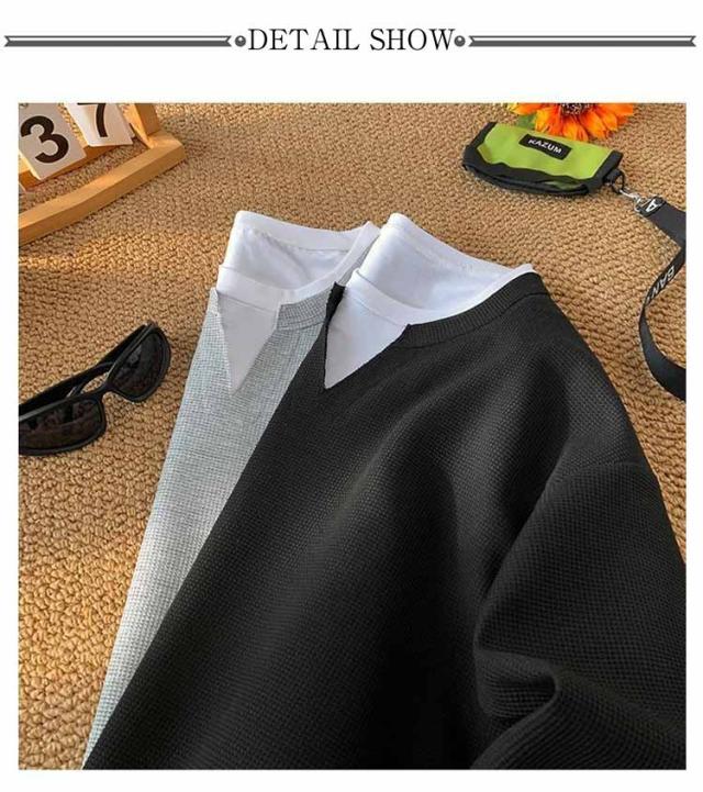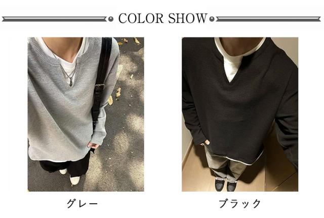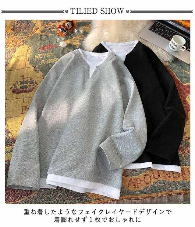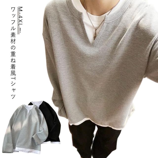Tシャツ レイヤード ロンt プルオーバー ワッフル トップス トレーナー 重ね着風 重ね着風 ゆったり 長袖tシャツ クルーネック おしゃれ カットソー 重ね着 シンプル 無地 大きいサイズ ユニセックス 春 秋 冬 秋冬