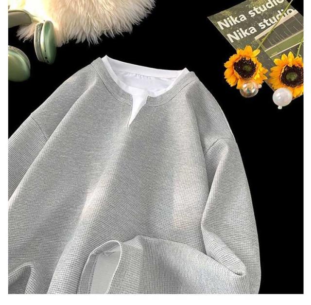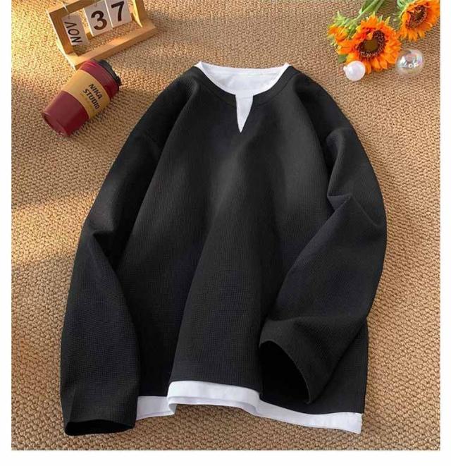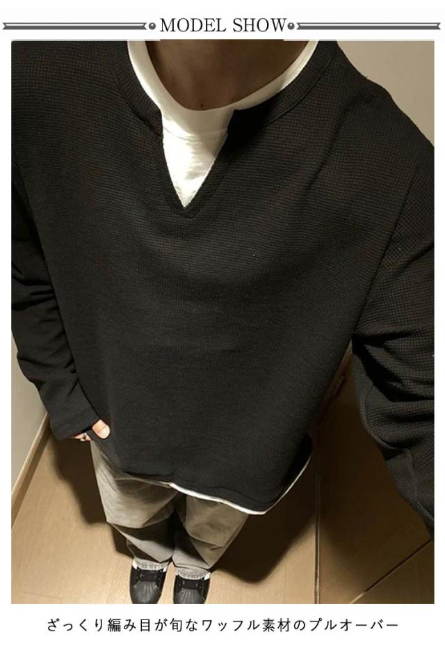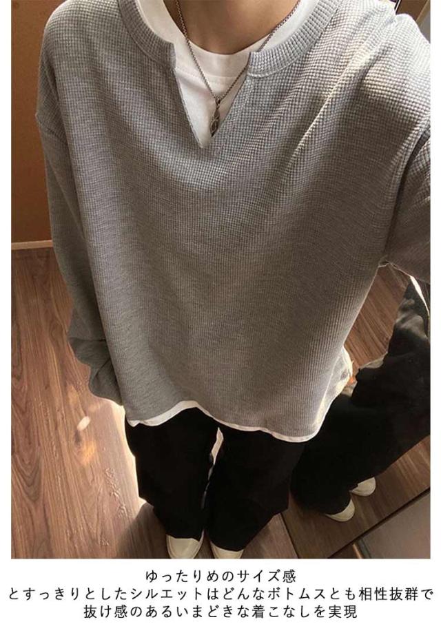 レイヤード Tシャツ ユニセックス メンズ プルオーバー ワッフル ゆったり トップス 重ね着風 トレーナー ロンt クルーネック おしゃれ カットソー 重ね着 シンプル 無地 大きいサイズ 長袖tシャツ 春 秋 冬 秋冬