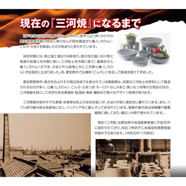 良質な三河粘土と耐火性の強い石川県七尾産の珪藻土を内側に使う二重焼きの七輪・コンロができ、かまどや火鉢等と共に三河焼七輪・コンロが全国的に広まりました