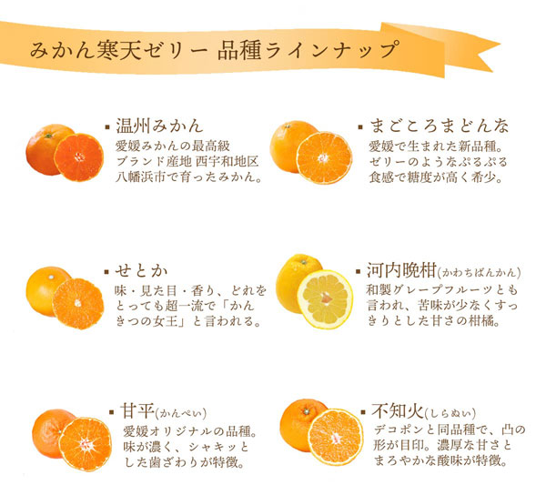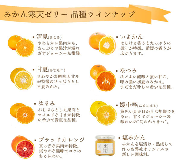 ・みかん・まごころまどんな・せとか・なつみ・はるみ・いよかん・不知火・甘平・河内晩柑・清見・甘夏・媛小春・塩みかん・ブラッドオレンジ
