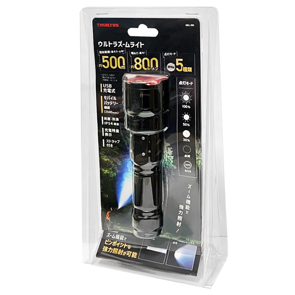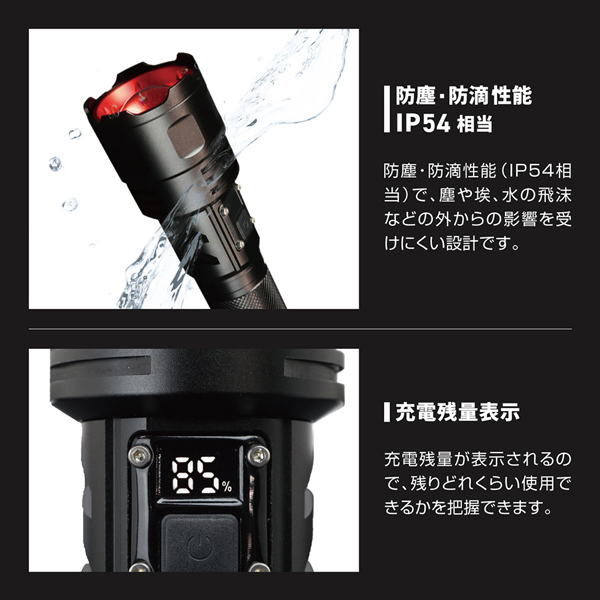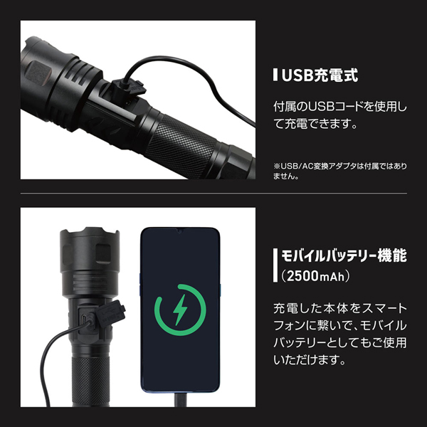 | 最大で約500m先まで照射! モバイルバッテリーとしても使える! | |