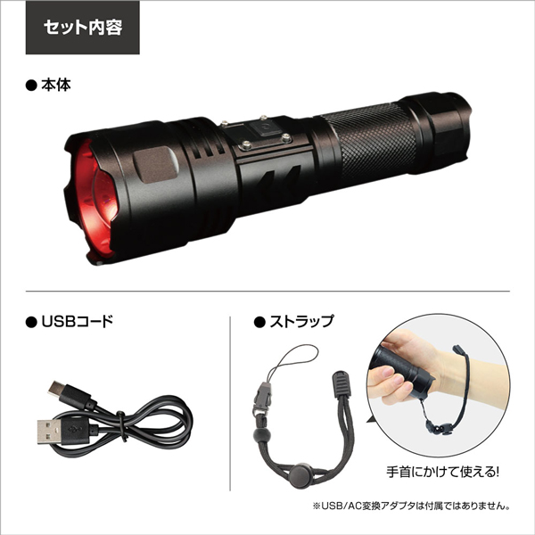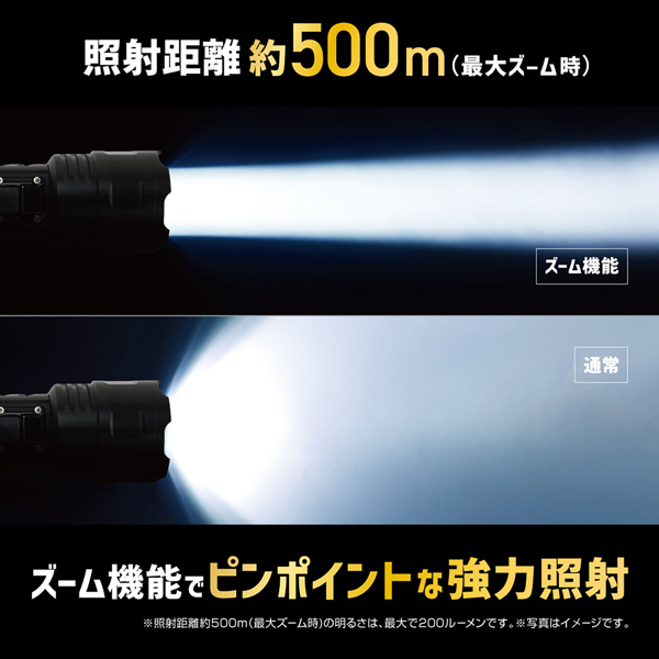 | 照射距離 | 最大ズーム時約500m ※最大ズーム時の明るさは、約200lm |