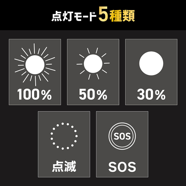 | 充電/使用時間 | [充電]約2.5時間(満充電)、 [使用]約2時間、SOSモード約4時間 ※時間は使用環境(充電池の使用期間やライトの明るさ等)によって異なります。 |